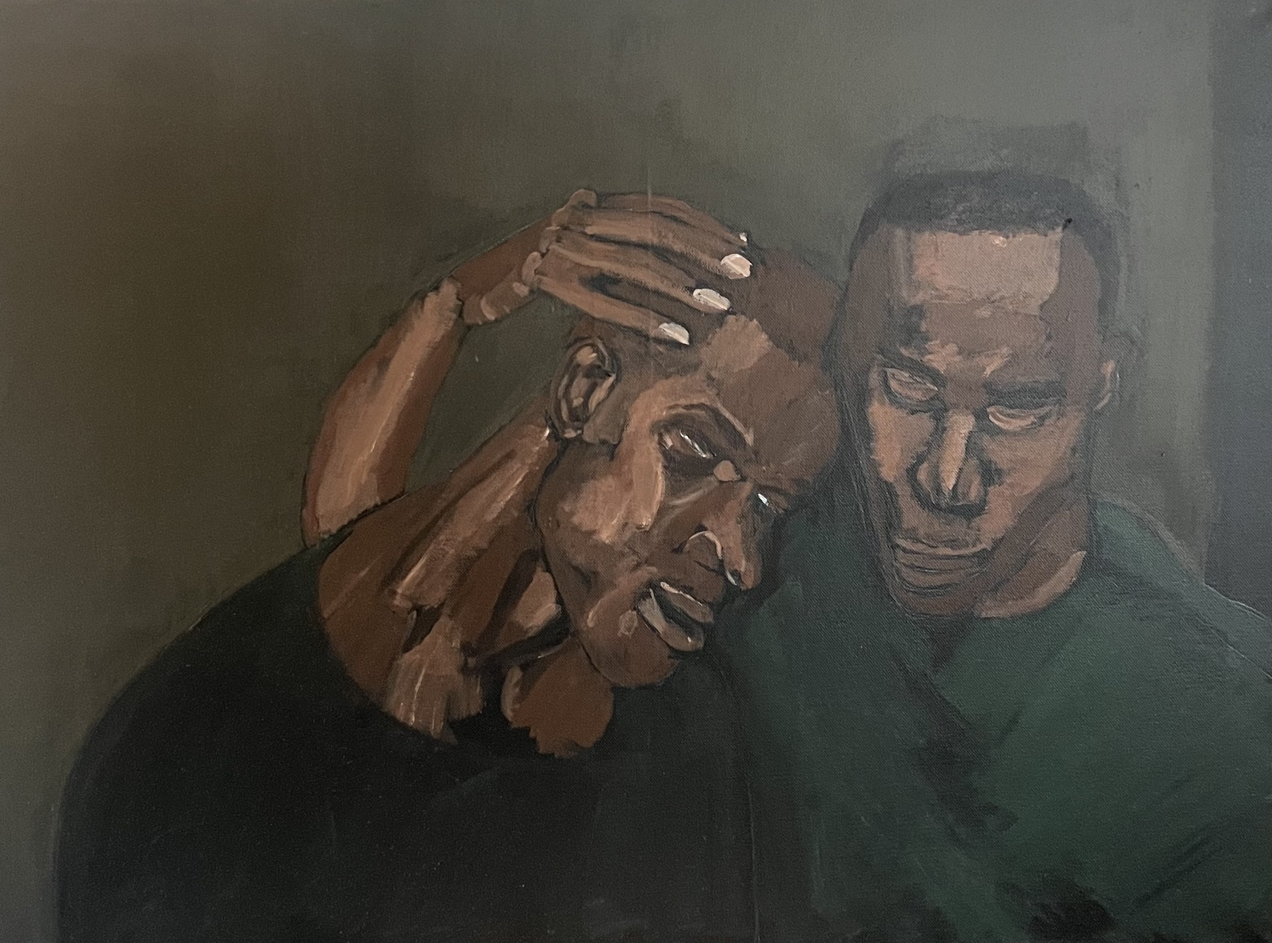 Painting of two women with dark skin, one resting her head on her hand and the other looking down, both with serious expressions.